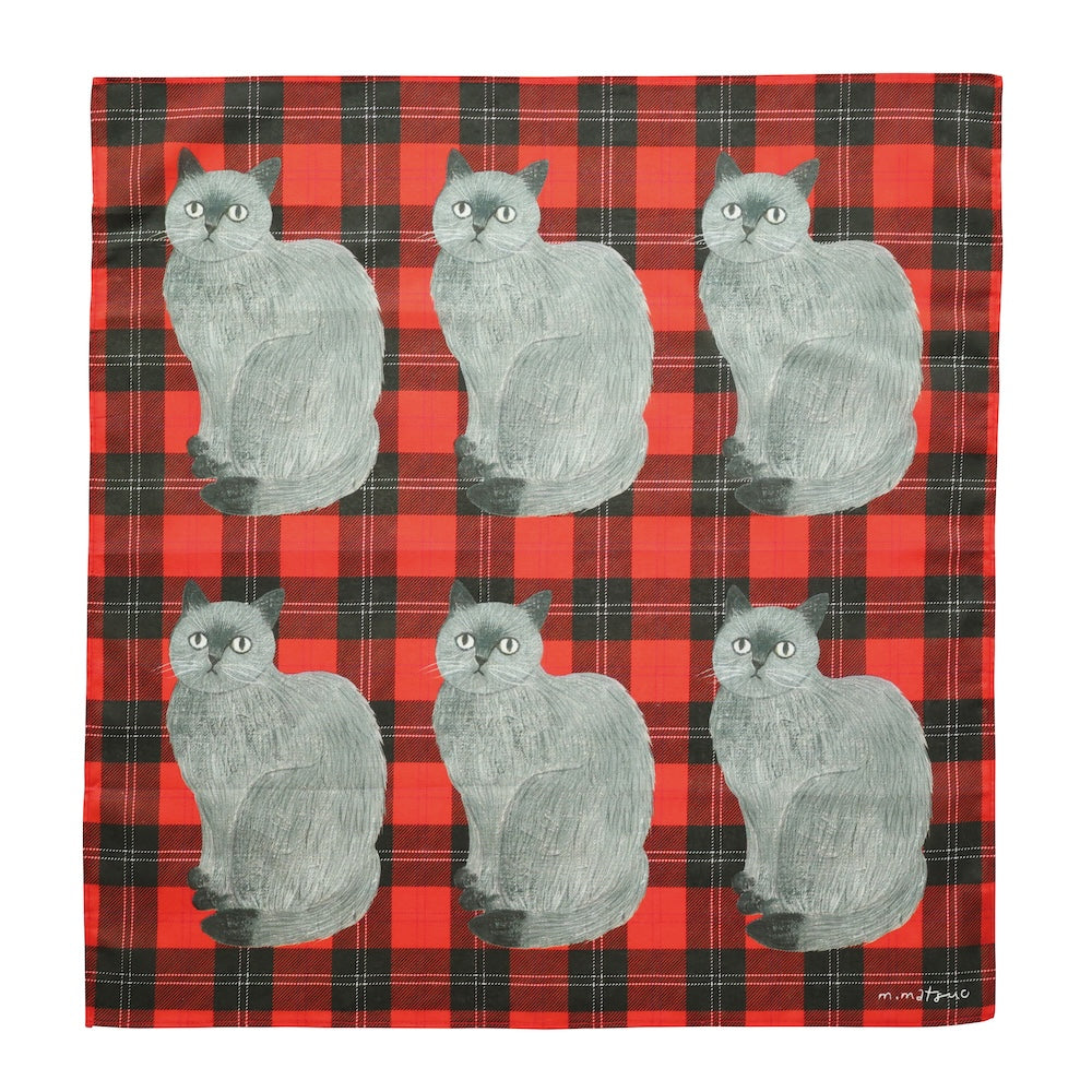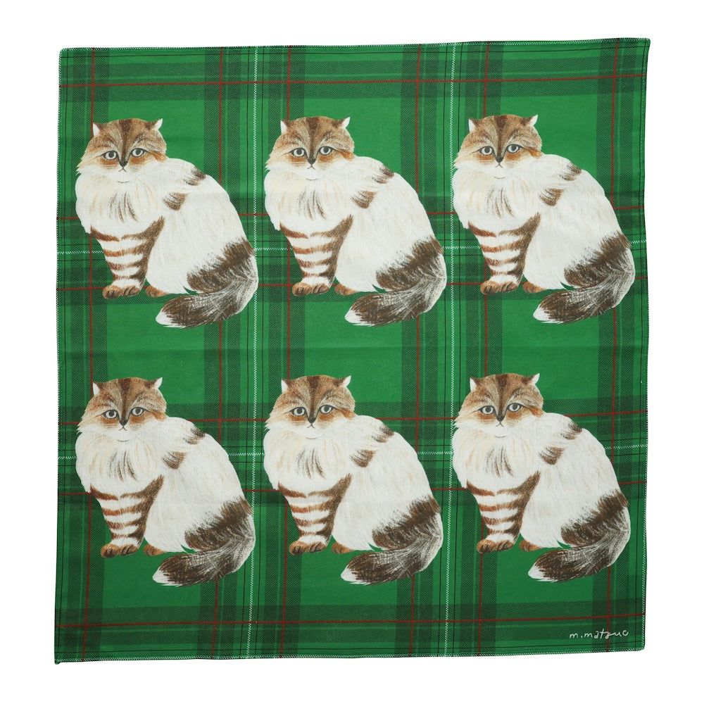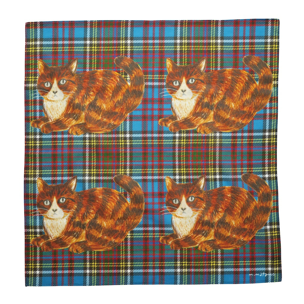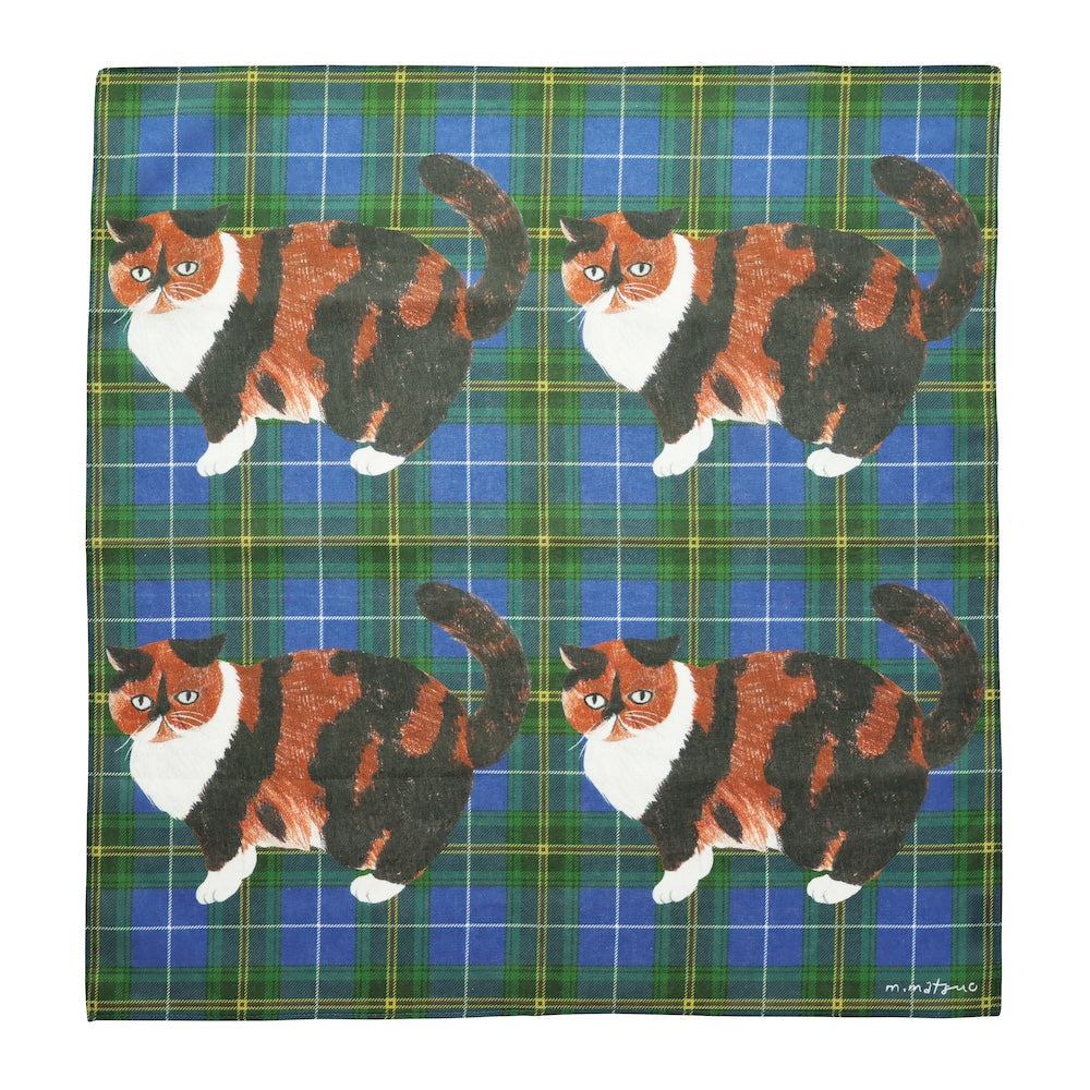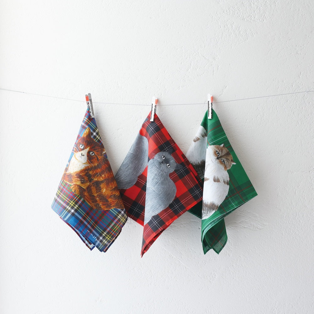温かみのあるチェック柄と、松尾ミユキさんの描く愛らしい表情のねこ達を組み合わせて、日常にほんのり彩りを添えてくれるようなハンカチを作りました。