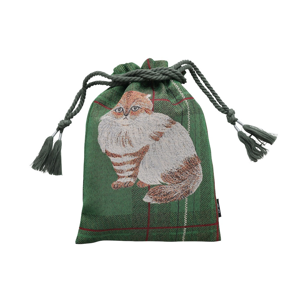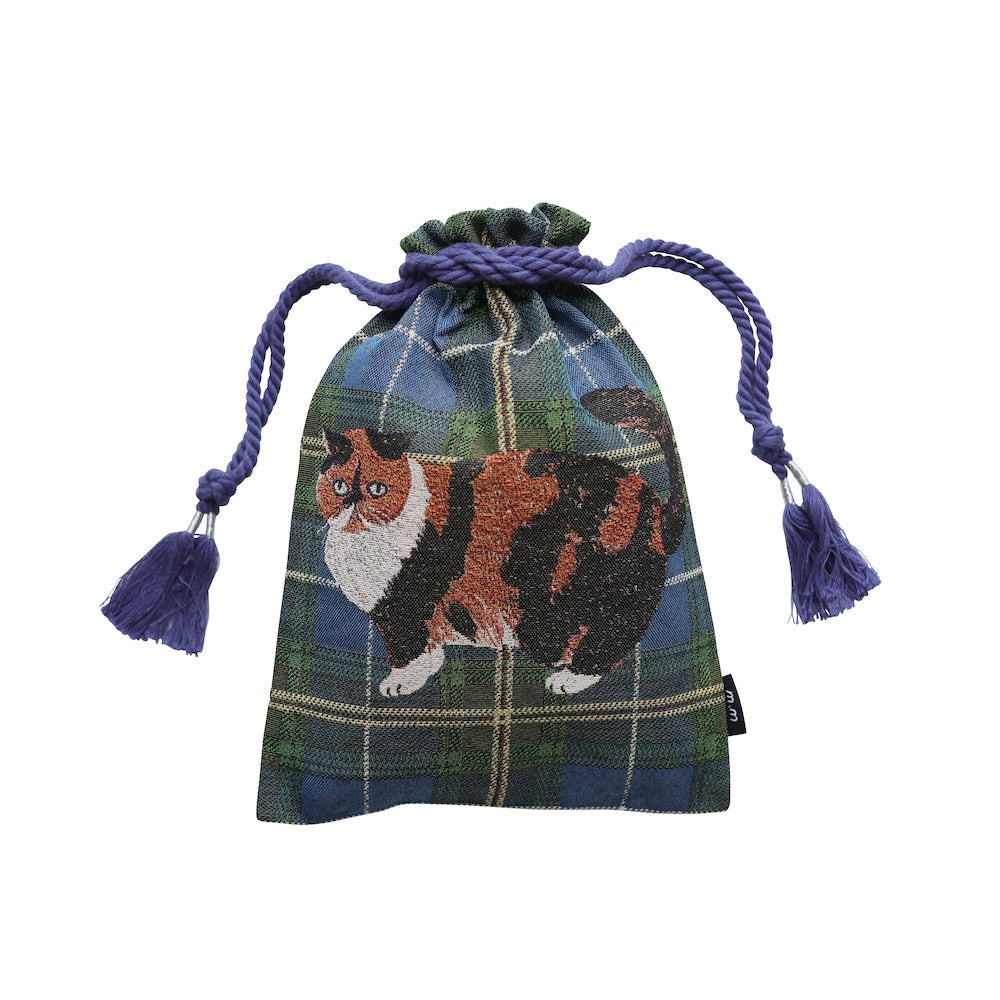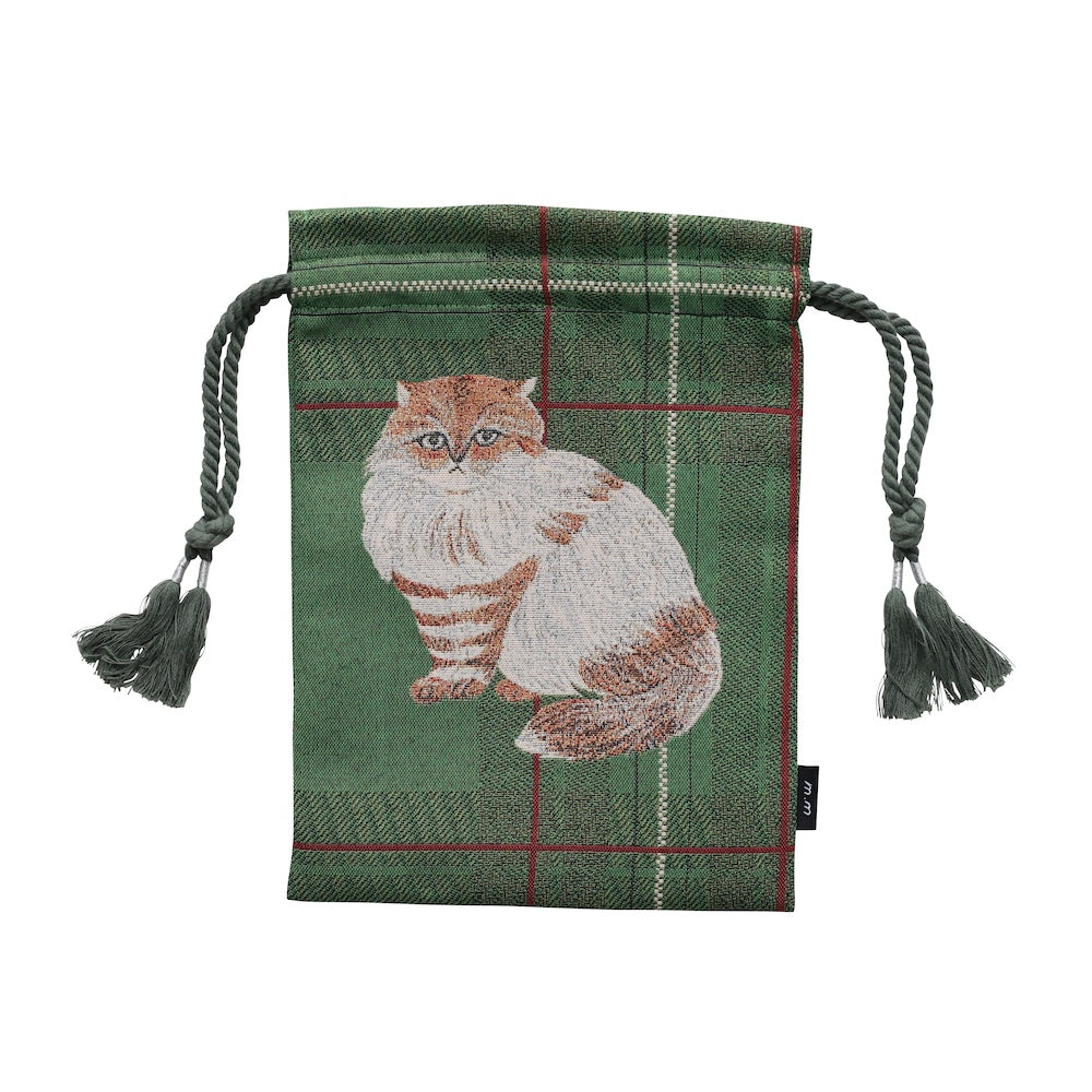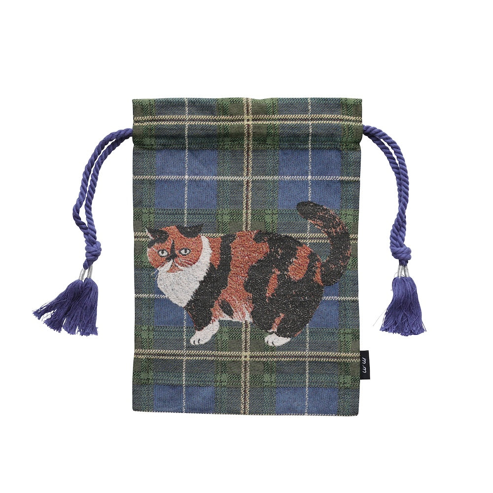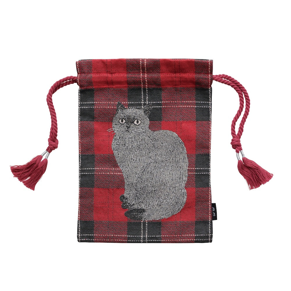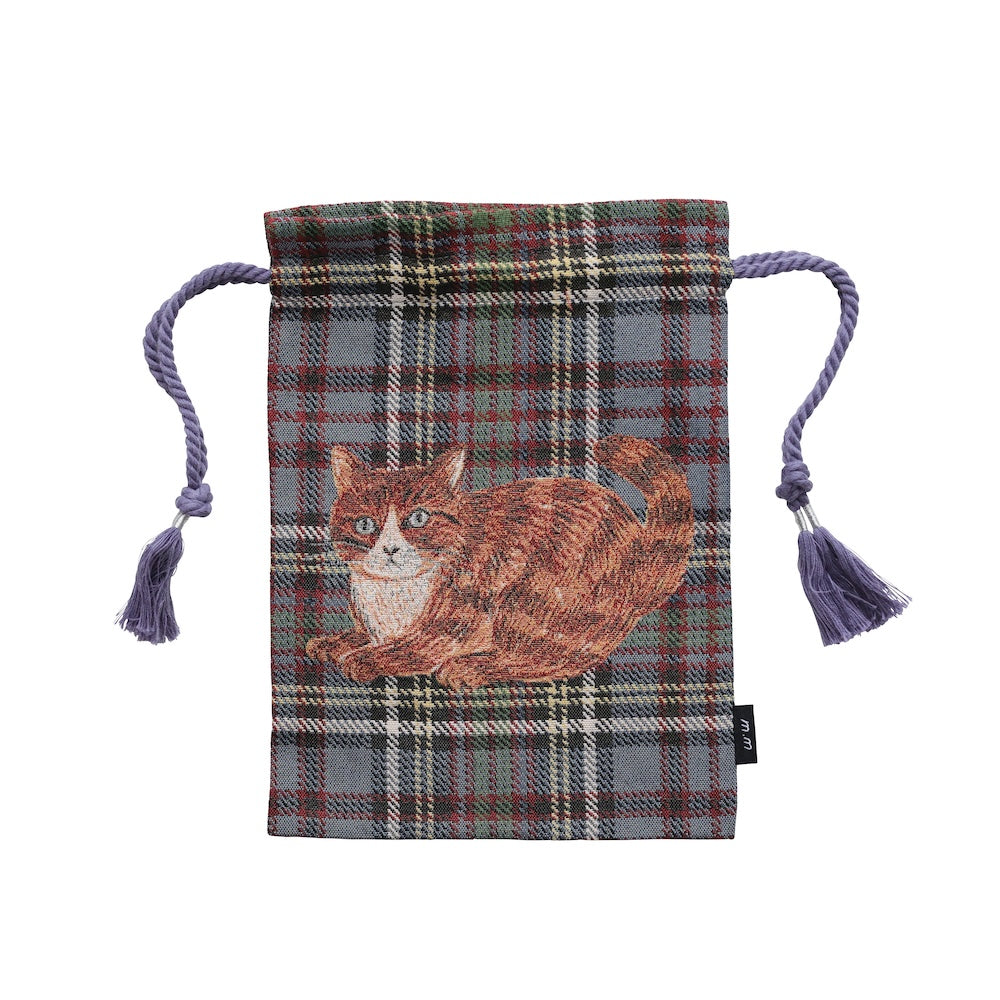 さまざまな表情やしぐさをみせてくれるネコ達が織り込まれた生地を使用して巾着を作りました。