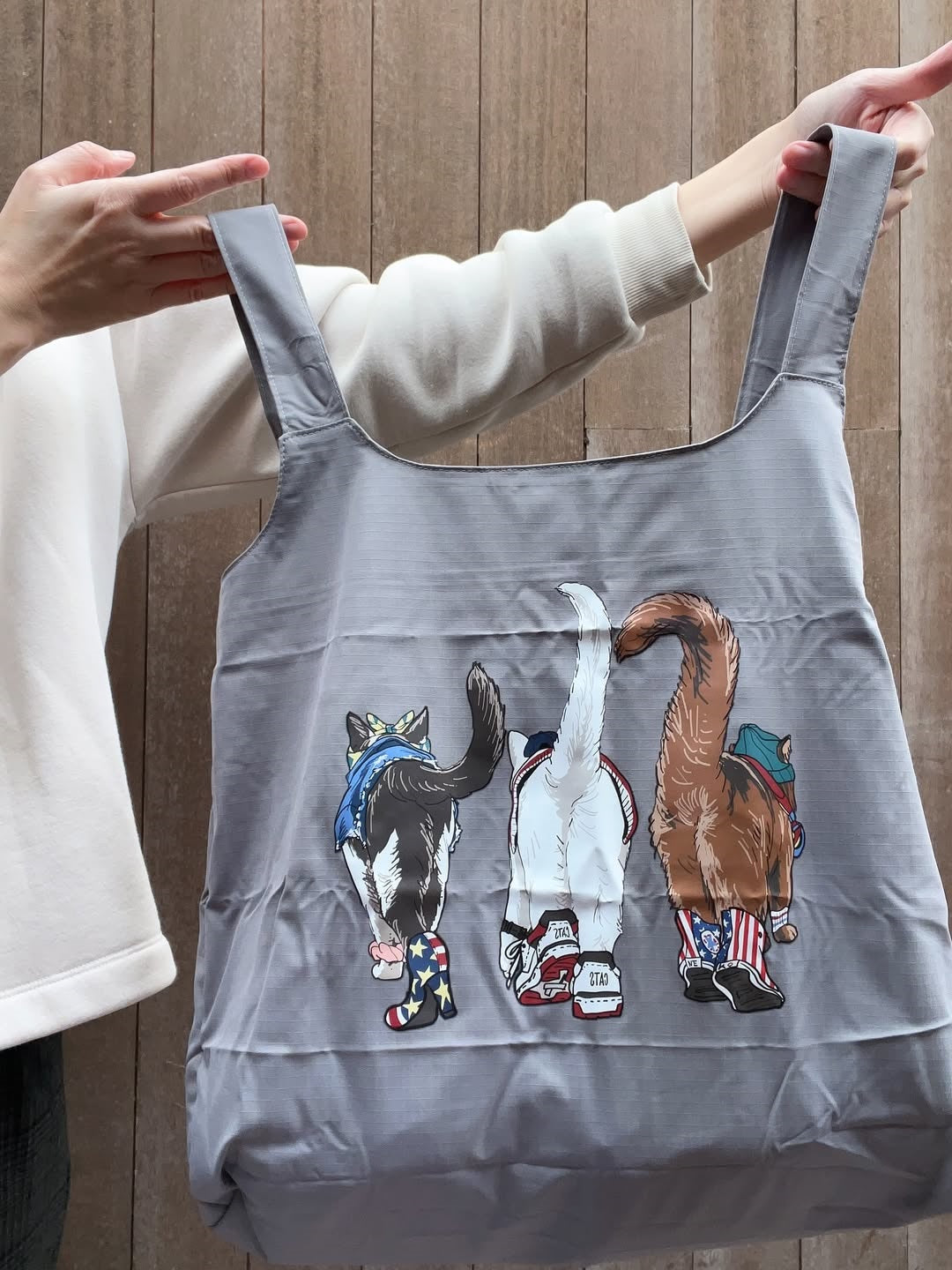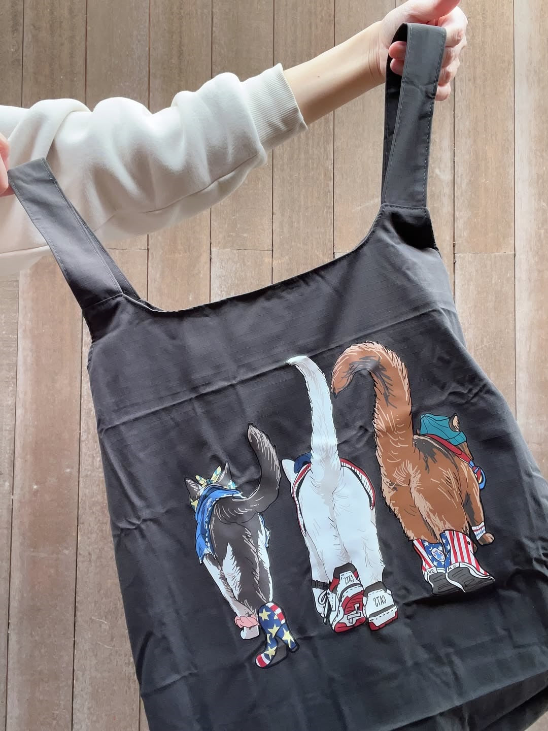 前後におしゃれをした動物がこちらへ向かってくるようなグラフィックがユニークなアイテム前面は前からのかわいい姿、後ろ面はつい笑みが出てしまうプリントです!