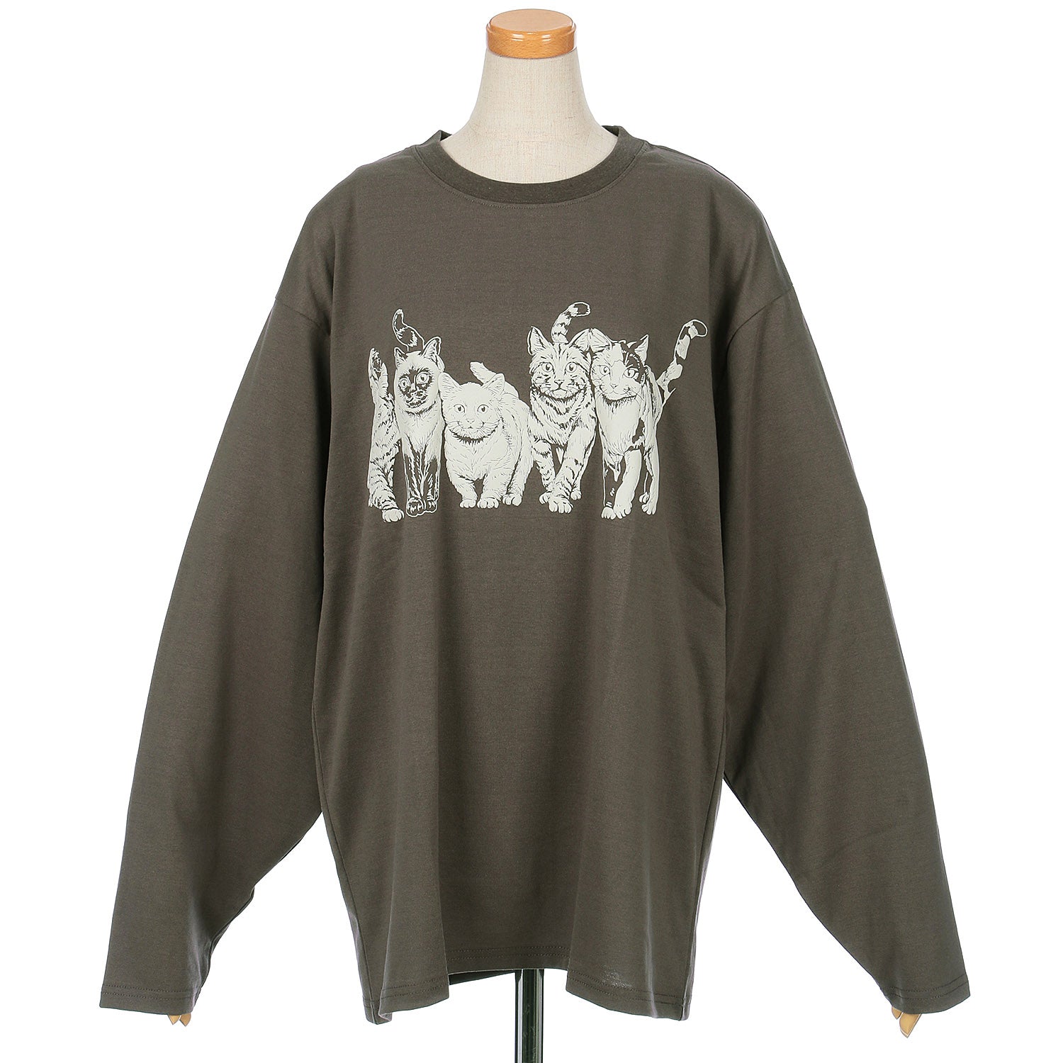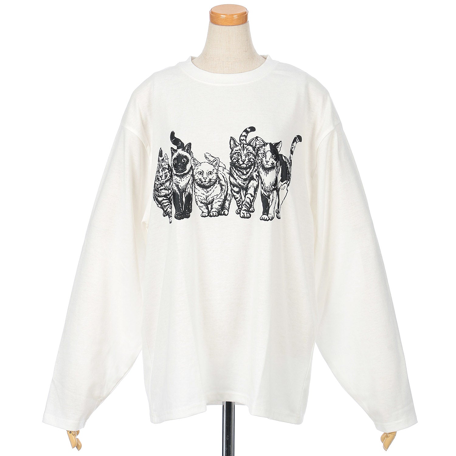 ≪猫好き必見アイテム!!≫Tシャツでも大人気だった猫シリーズからロンTが登場!前後のプリントどちらも見て欲しい、猫たちがこちらへ向かってくるようなグラフィックがユニークなアイテム。バックスタイルには猫犬たちの後ろ姿が描かれ、注目されること間違いなし!オーバーサイズに着用できる肩幅と身幅を広めにとったユニセックスサイジングとなります。
