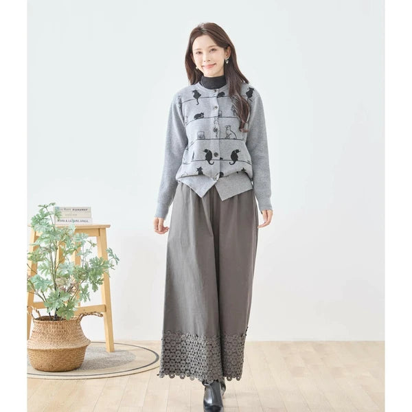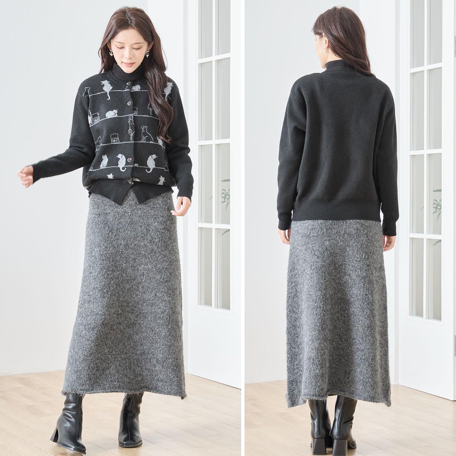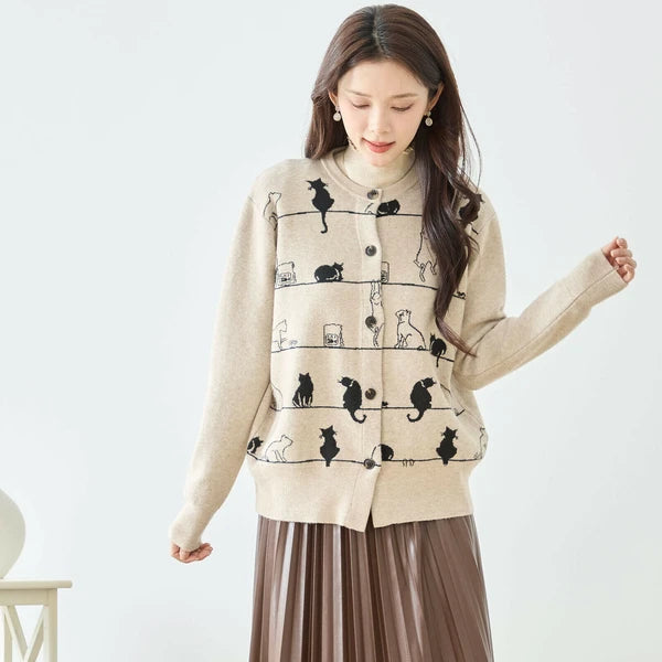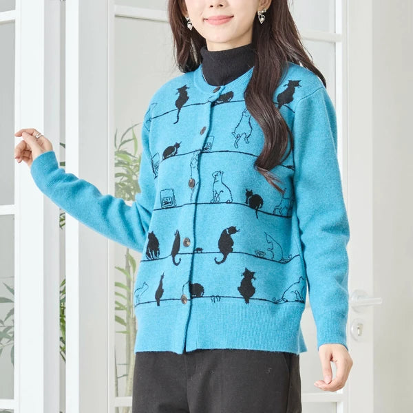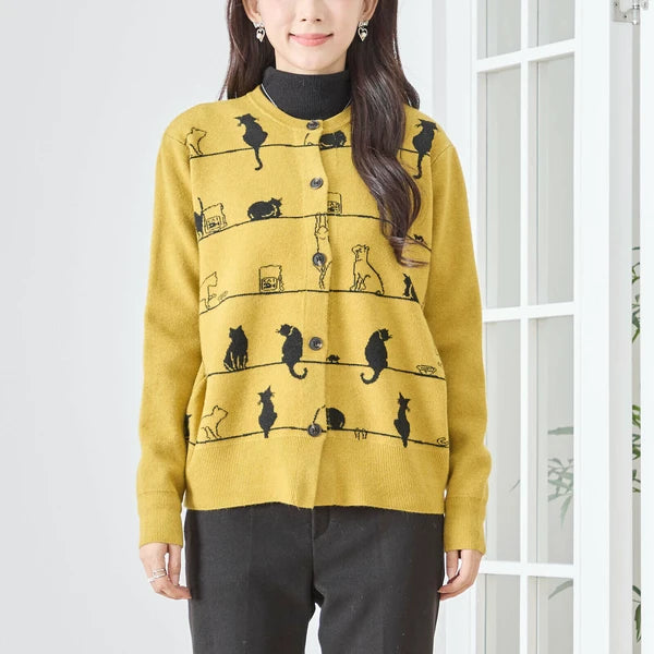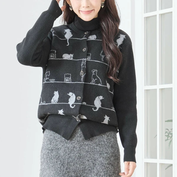 遊び心あふれる猫のシルエットをジャカード編みで表現したカーディガン。